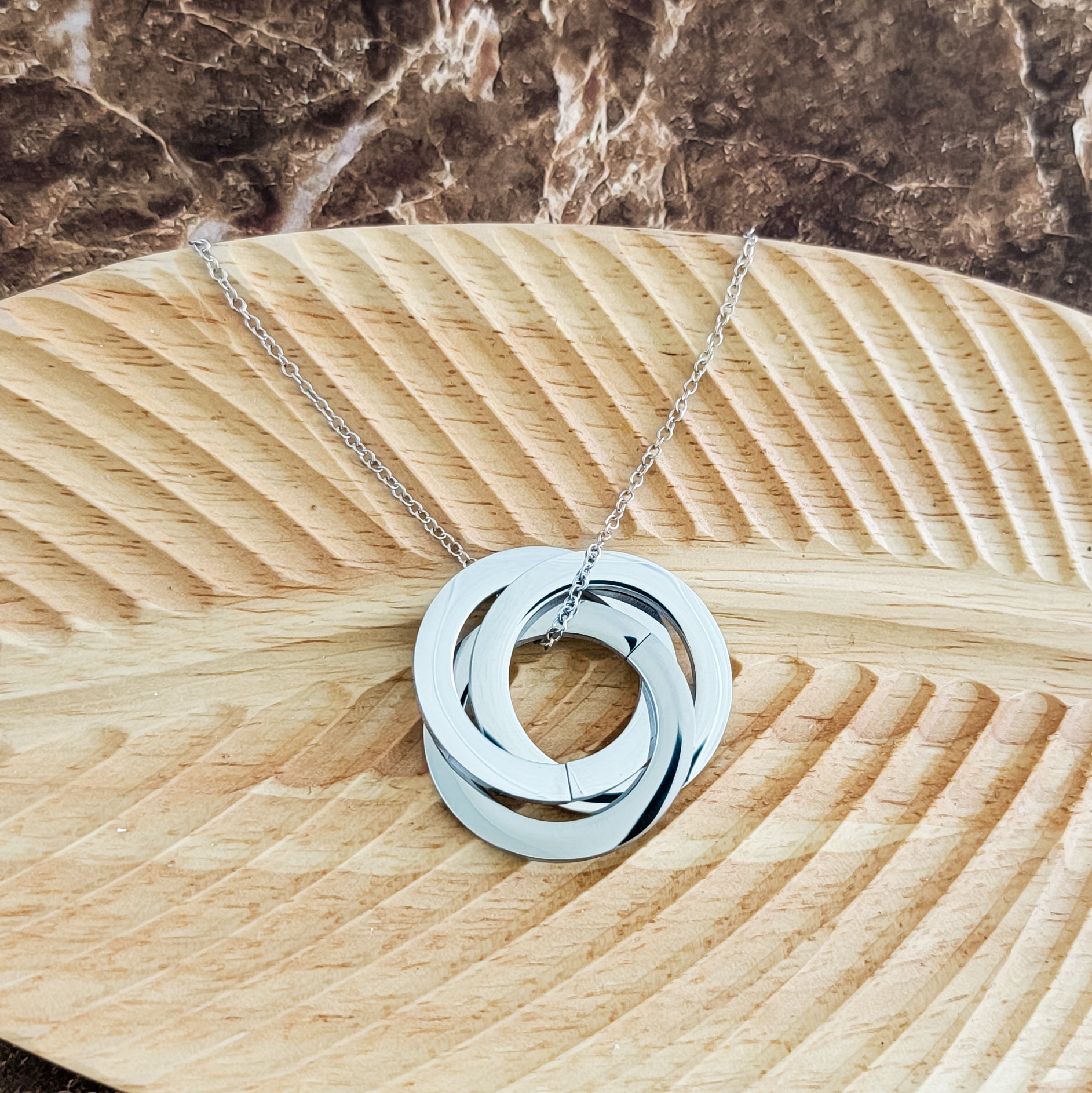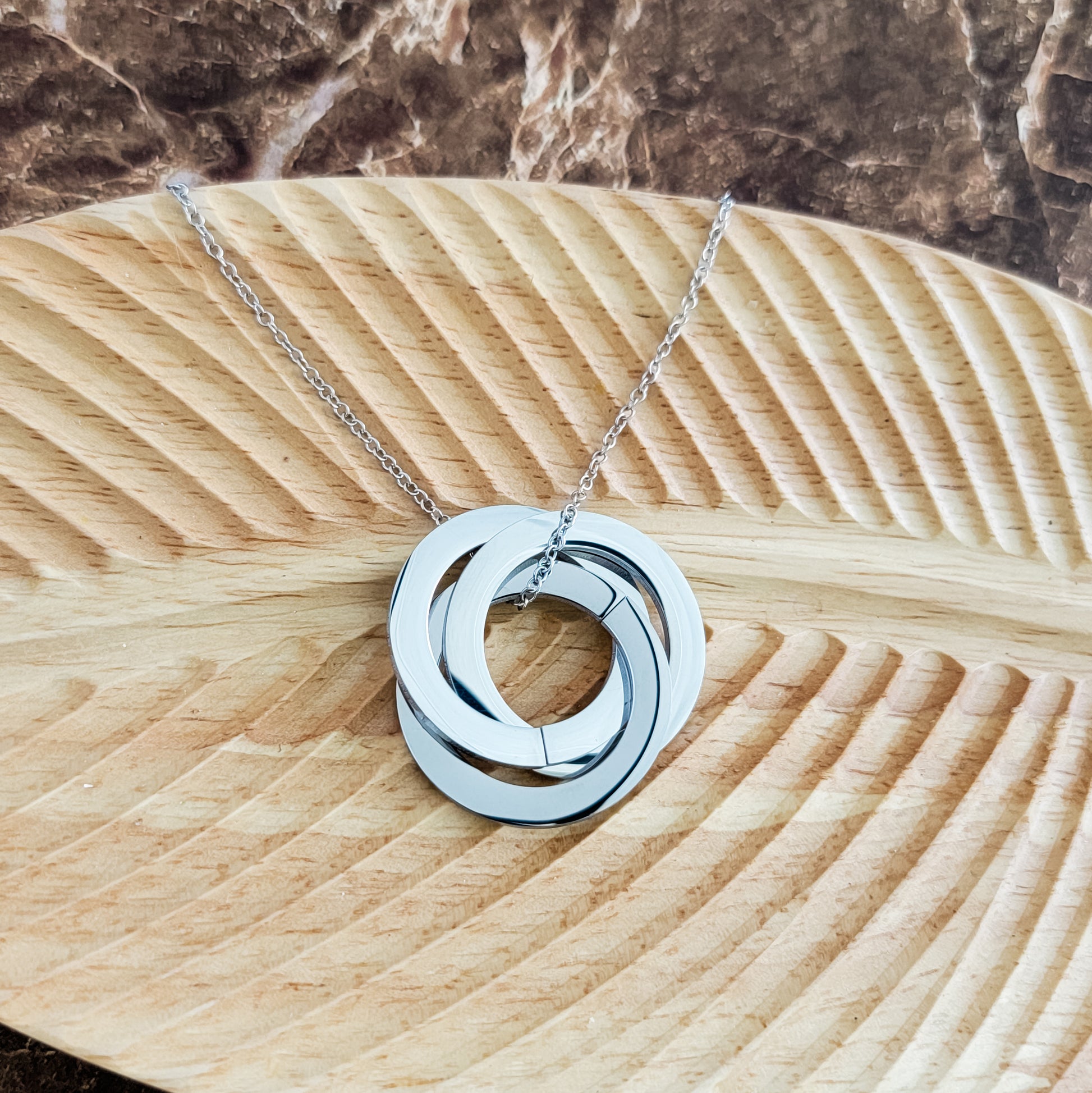 • Quantity: 1 necklace total; 2 of the 3 circles have a slice in the metal and can be removed if you want a single or double circle instead of 3 interlocking