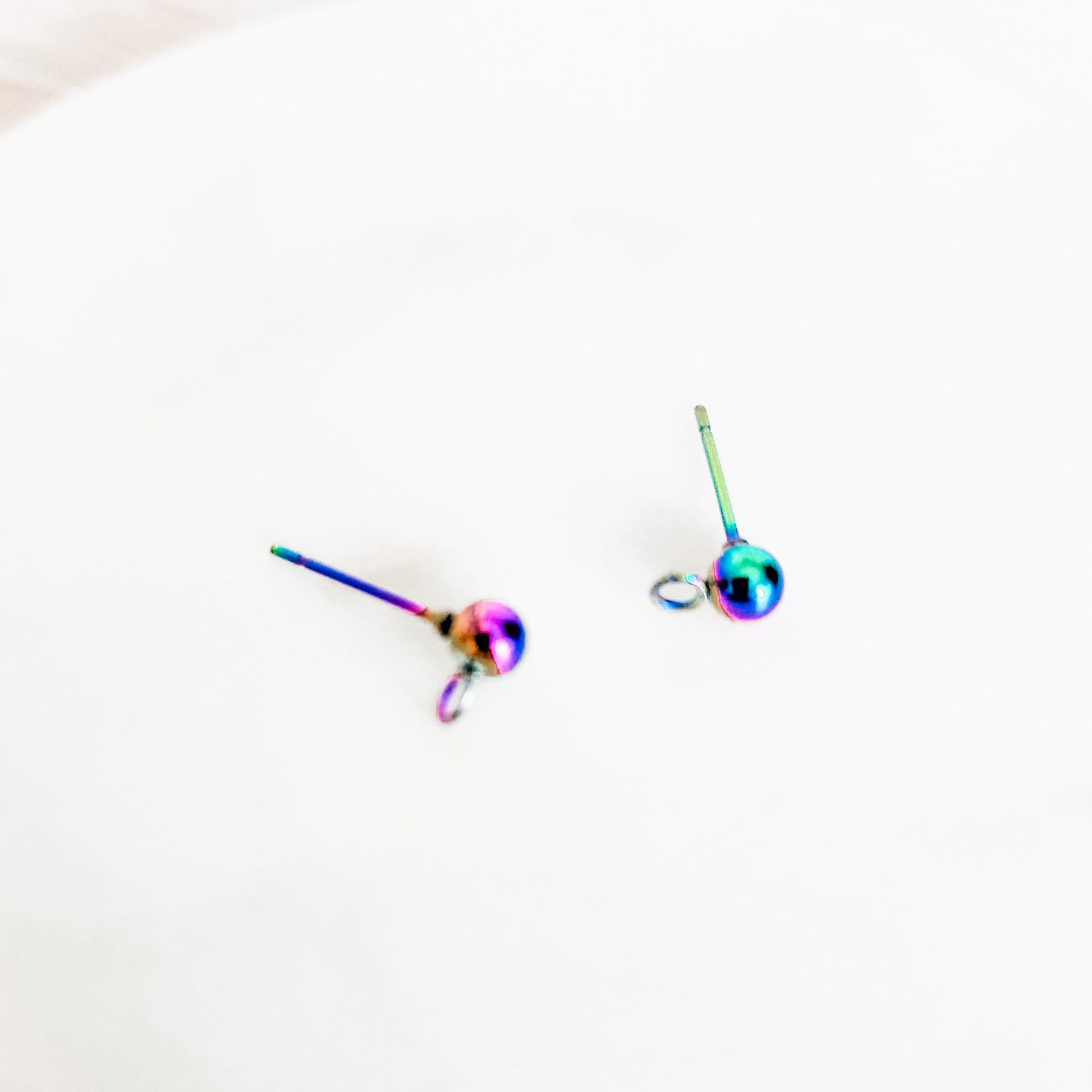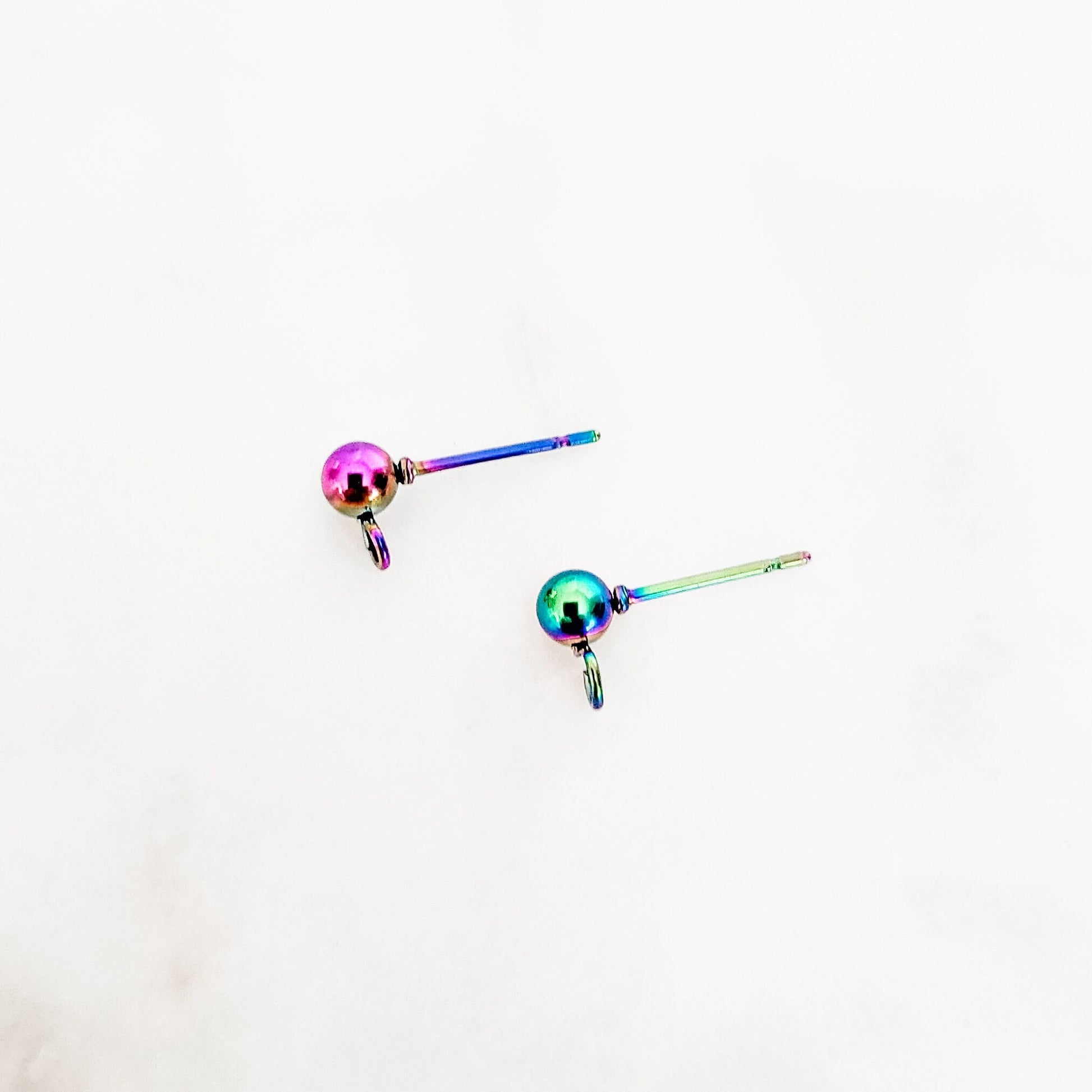 Rainbow stainless steel ball stud posts with loops by Monarch Pine Craft Supply are an excellent choice to create beautiful, high quality DIY stud earrings. Made from surgical stainless steel, these high-quality posts are hypoallergenic and tarnish-resistant. Pair with metal, acrylic, leather, wood, and more using jewelry glue. This listing is for 10 individual pieces (5 pairs).